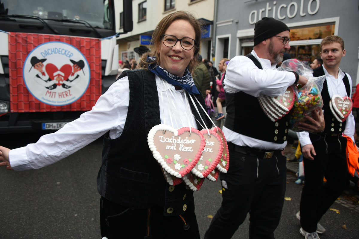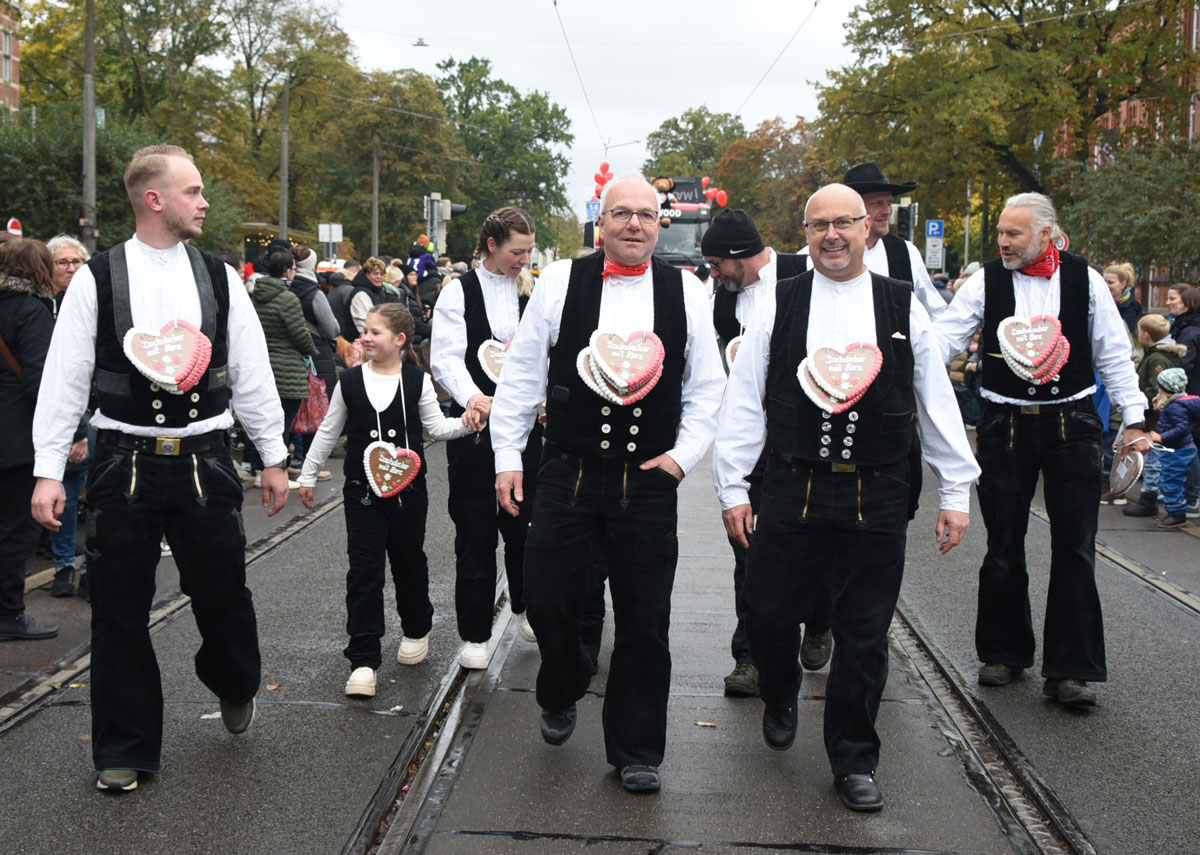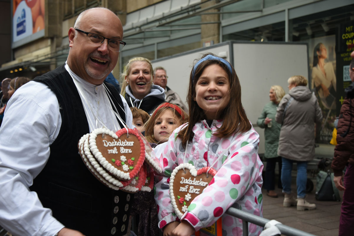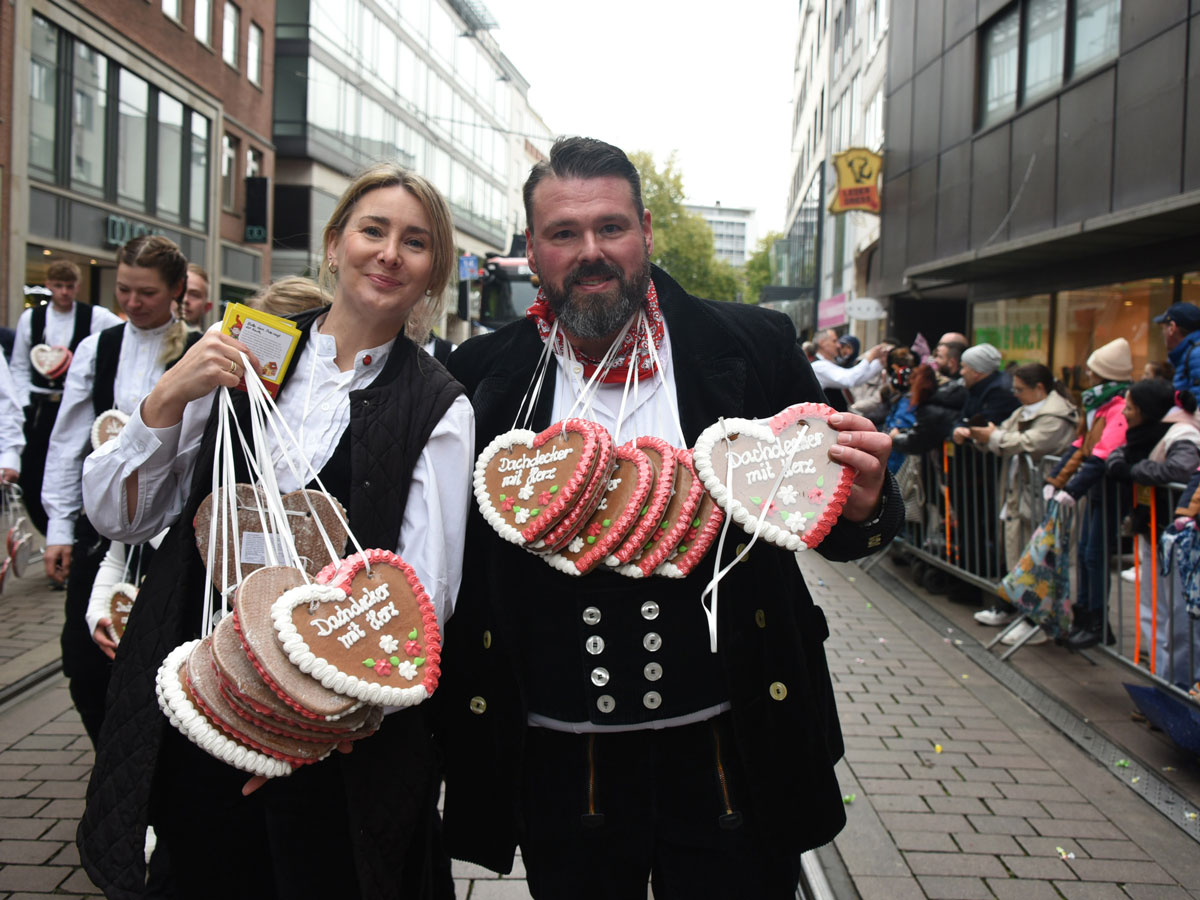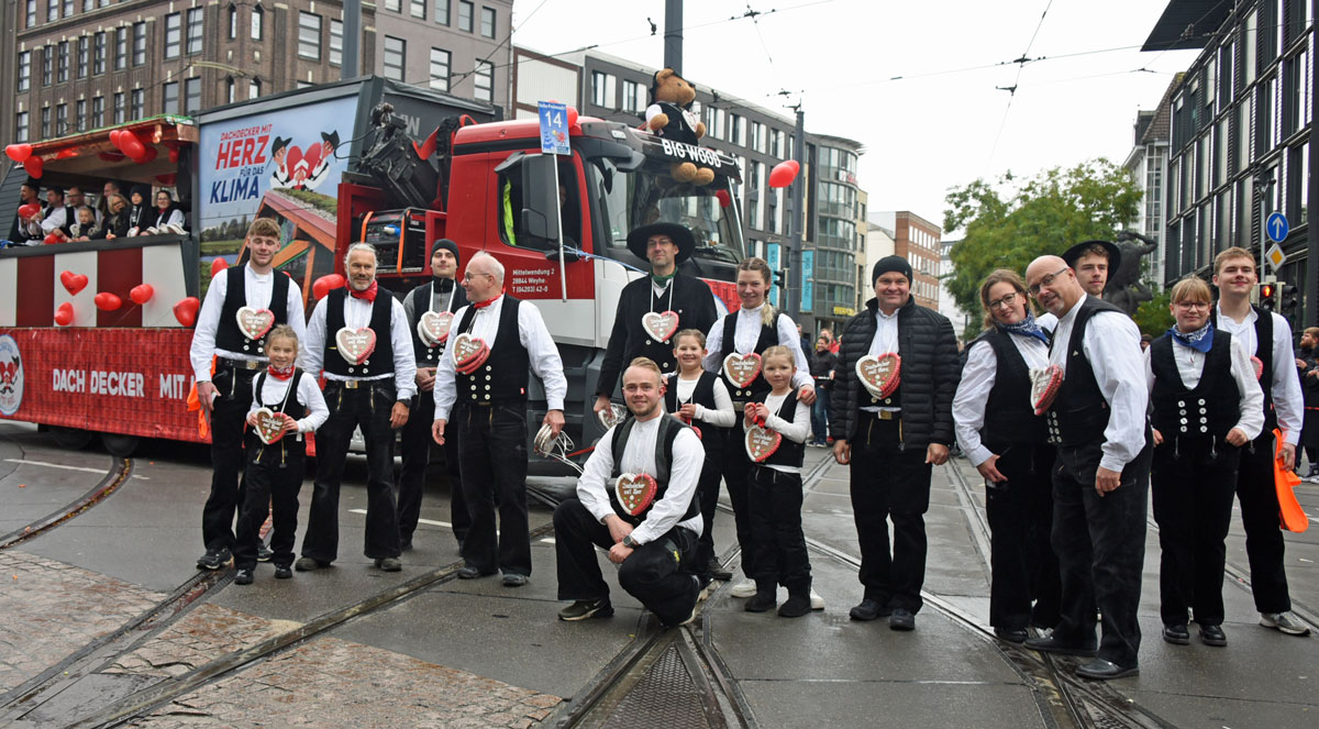 Auch 2025 zeigten die zünftig gekleideten „Dachdecker mit Herz“ wieder einen Teil ihres Leistungsspektrums, verteilten Bonbons, Informationen über den Berufsstand und die heiß begehrten Lebkuchenherzen. Mit einem Gründach versehen, transportierte der von Innungsmitgliedern geschmückte LKW „Big Wood“ der DEX eG, Weyhe die Handwerker und Freunde der Innung sicher durch die Zuschauermenge.